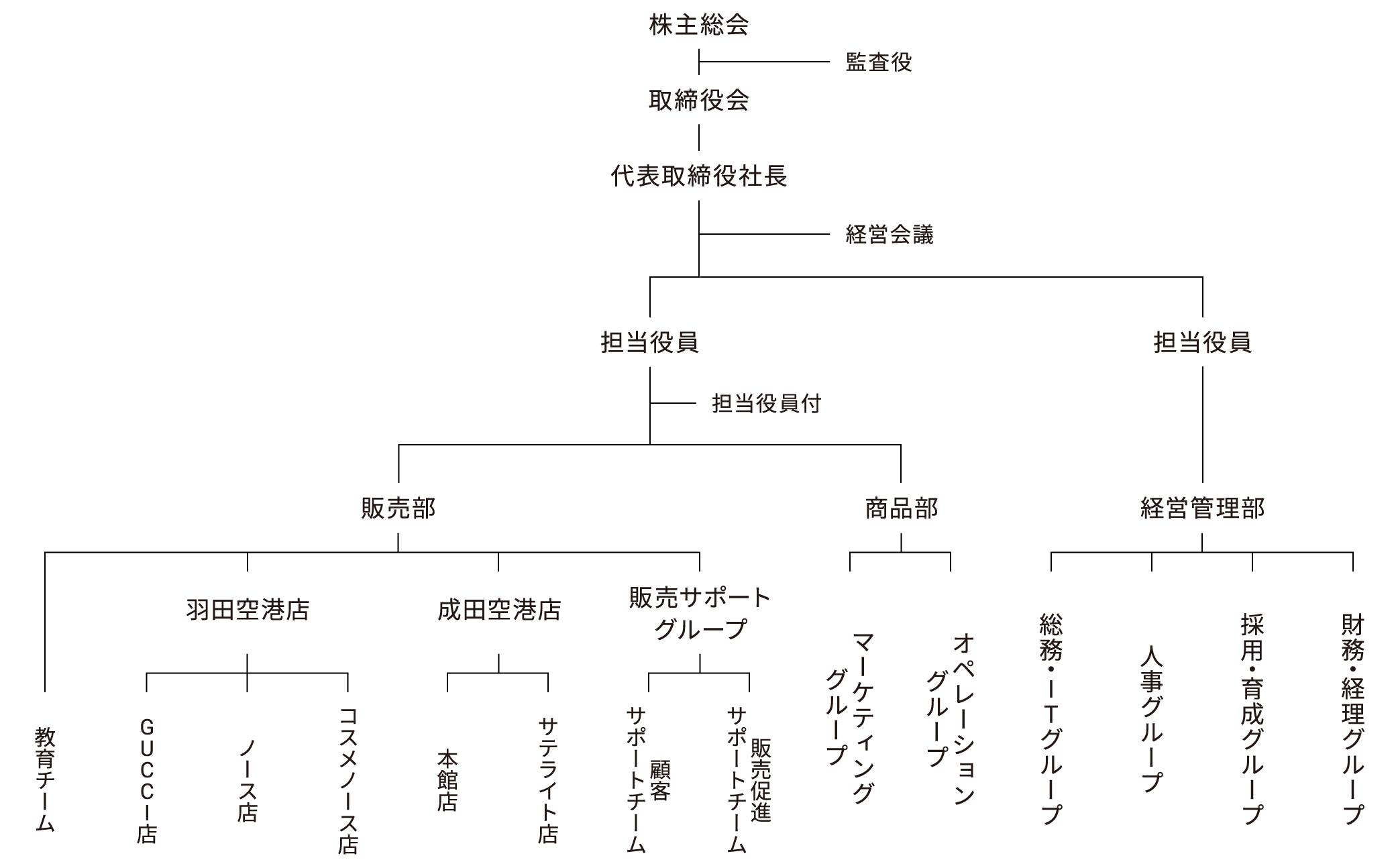 1992年12月6日 成田国際空港第2旅客ターミナル内 本館店およびサテライト店オープン2010年10月21日 羽田空港国際線旅客ターミナル(現第3ターミナル)内 TIAT DUTY FREE SHOP NORTHオープン(受託店舗)2020年4月4日 羽田空港第3ターミナル内 COSMETIC BOUTIQUE NORTHオープン(受託店舗)